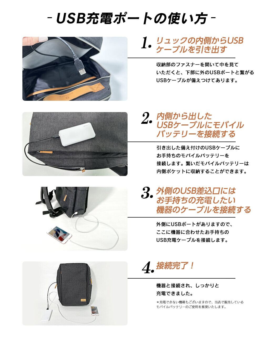 ●リュックを担いだままでもUSB充電が可能な最新モデル。