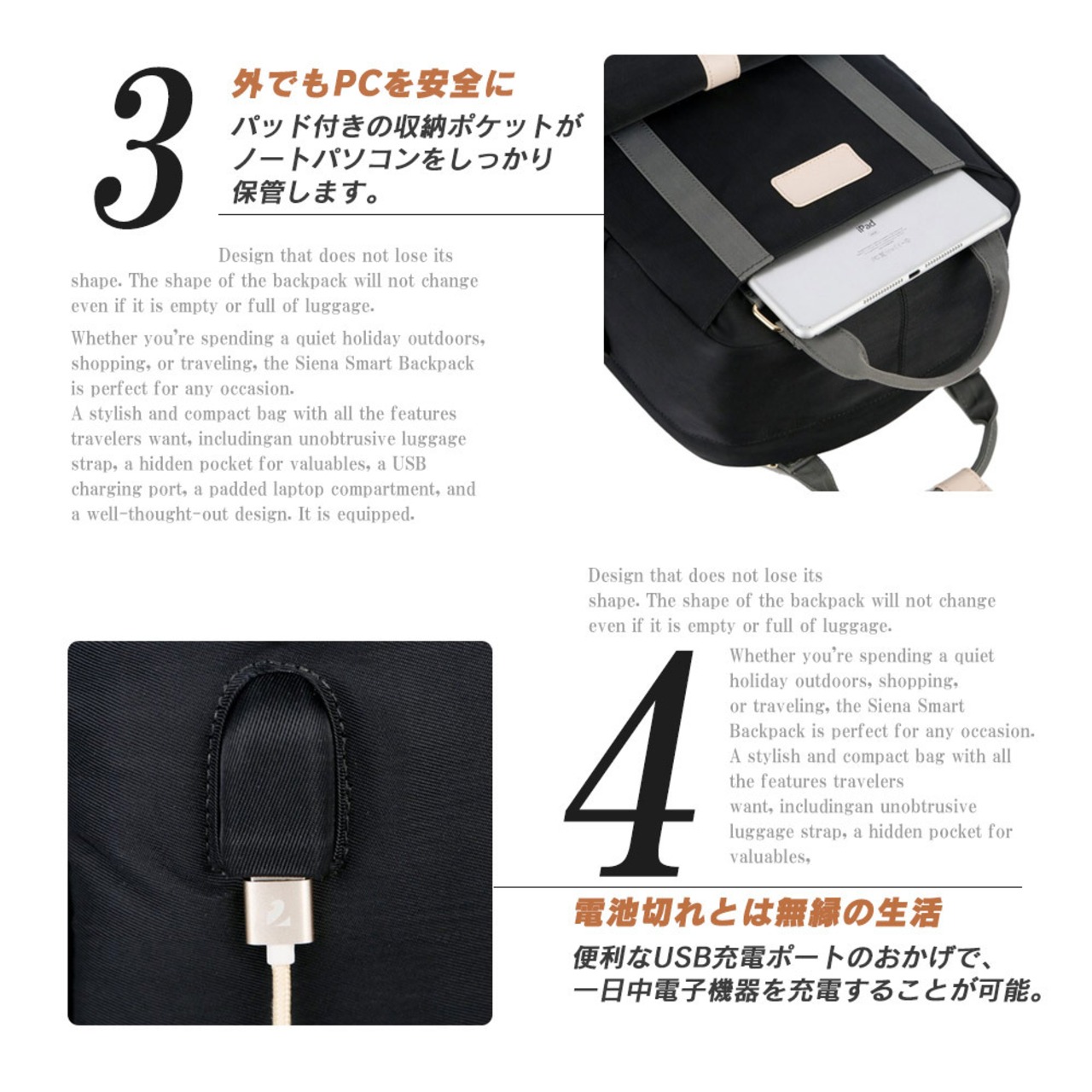 ●USB充電ポート付きで充電器を鞄から出さずに充電可能