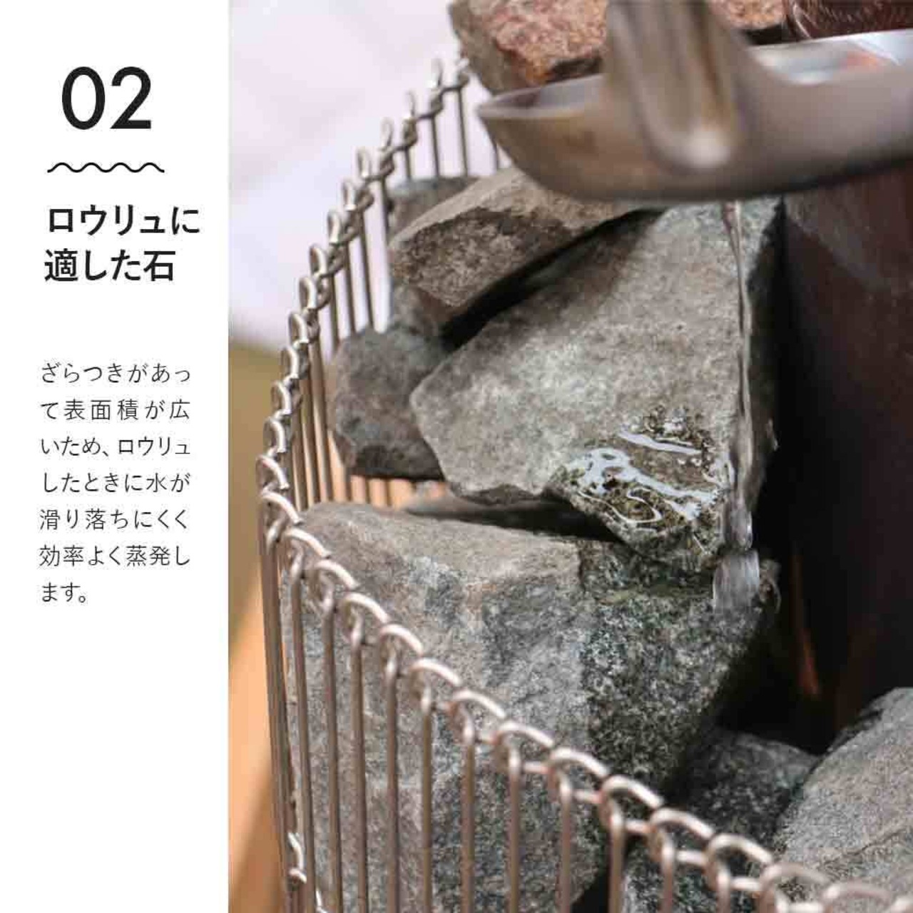 ●ざらつきがあって表面積が広いため、ロウリュしたときに水が滑り落ちにくく効率よく蒸発します。