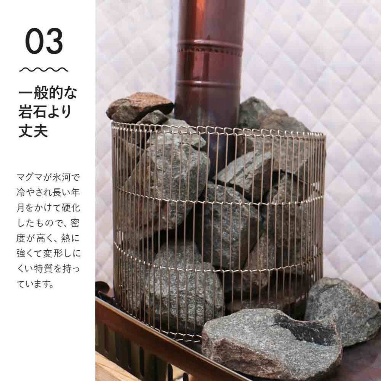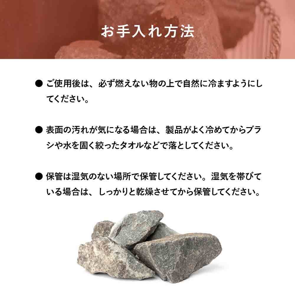 ●このサウナストーンは蓄熱性の高い火成岩(火山岩)の中でも特に強度の高い玄武岩を使用。