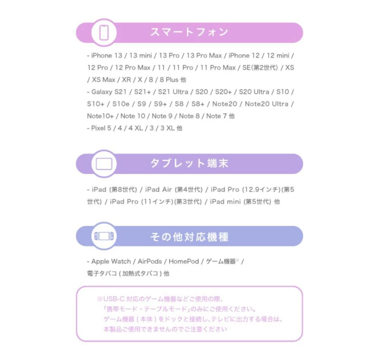 ●幅広い対応機種(iPhone〜AndroidだけでなくAirPodsなどのスマートデバイスに対応)