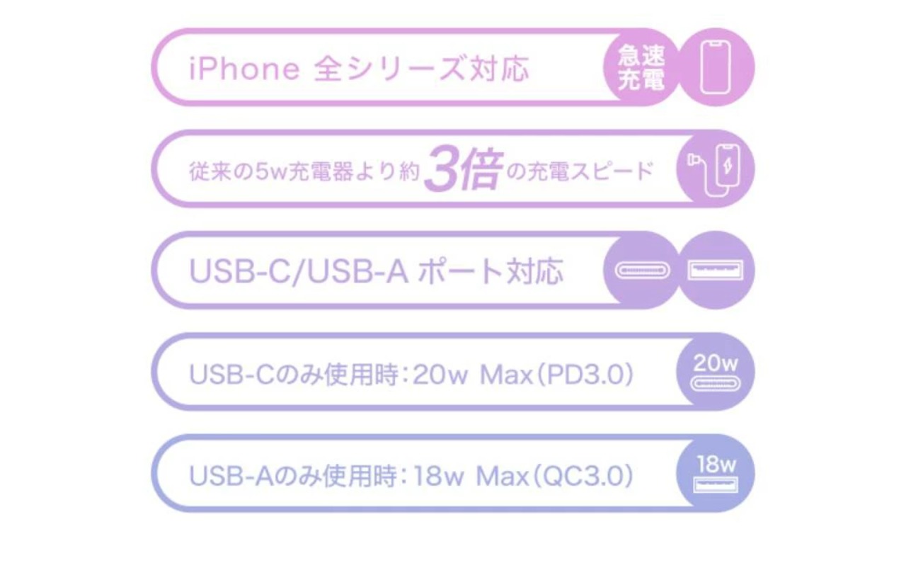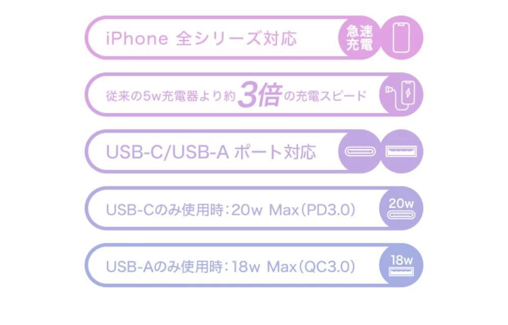 ●最大20w出力対応のUSB-Cポート、USB-Aポートが2ポート搭載されたUSB充電器で、
