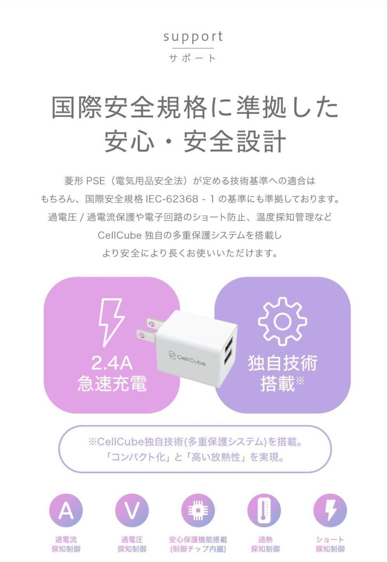 【安全安心 日本ブランド】USB コンセント 急速充電 ACアダプター USB充電器 2.4A 12w 2ポート PSE認証 おしゃれ かわいい パステルカラー 超コンパクトサイズ スマホ タブレット 各種対応 [ CellCube 折りたたみ式プラグ CC-AC02 ]