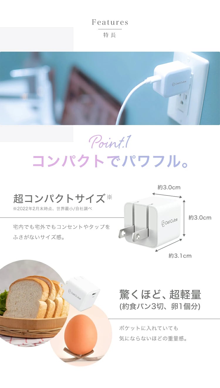 ●プラグ折り畳み式では世界最小クラス3×3cmの超小型ボディ(※2021年11月自社調べ)