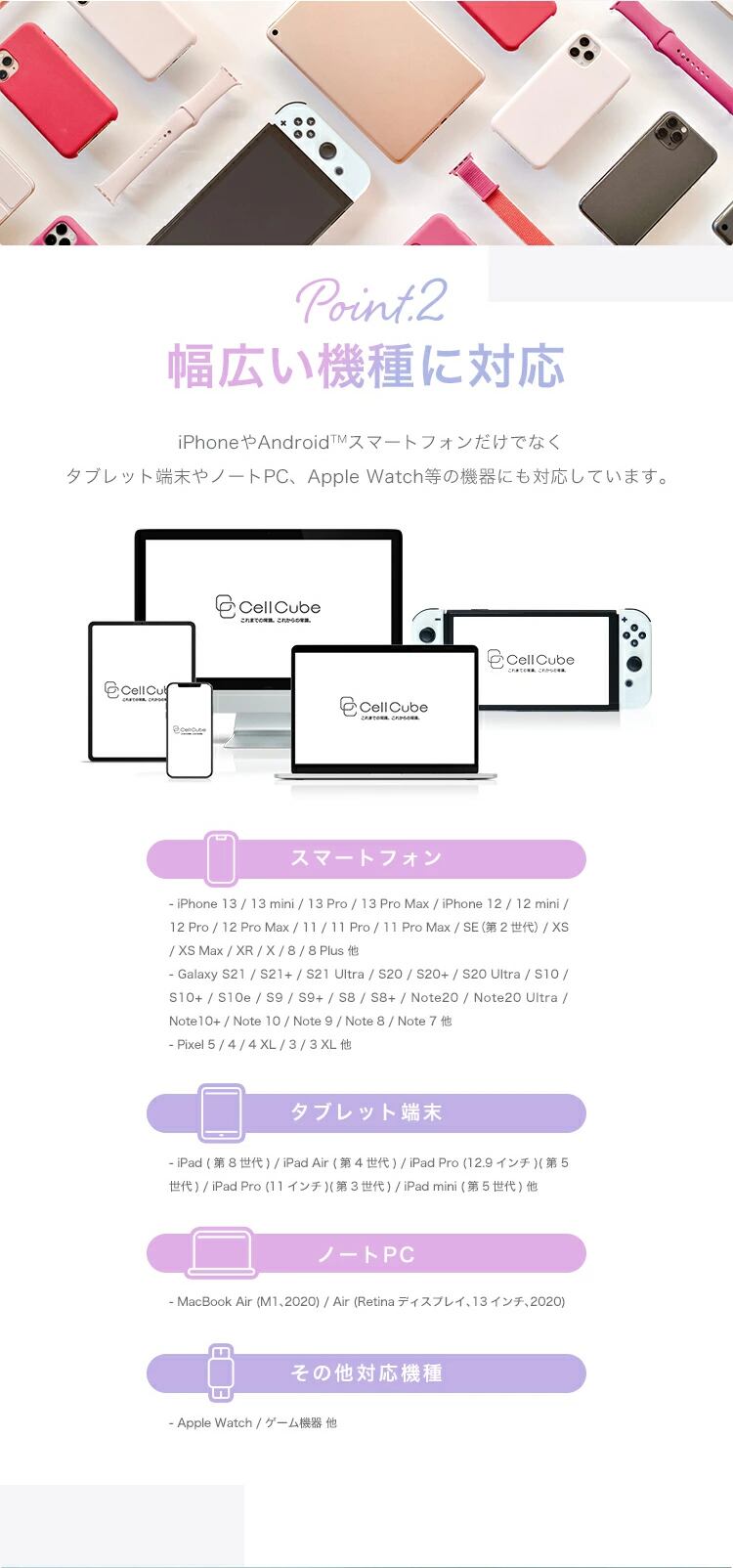 ●幅広い対応機種(iPhone〜AndroidだけでなくAirPodsなどのスマートデバイスに対応)
