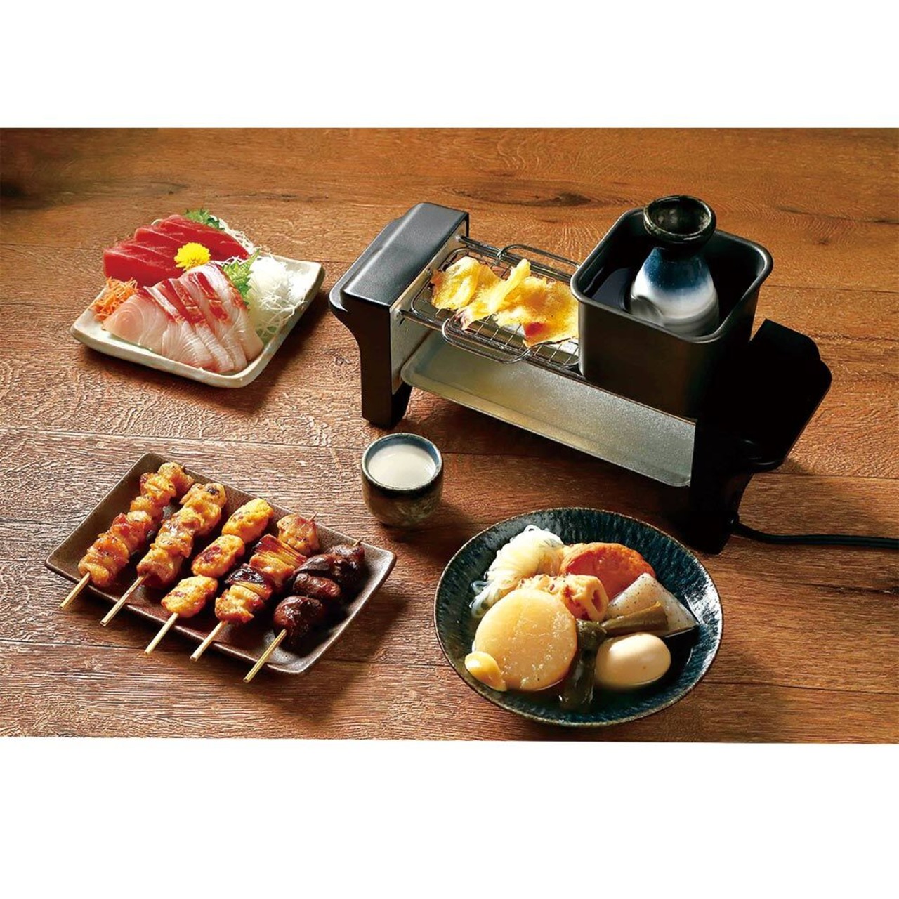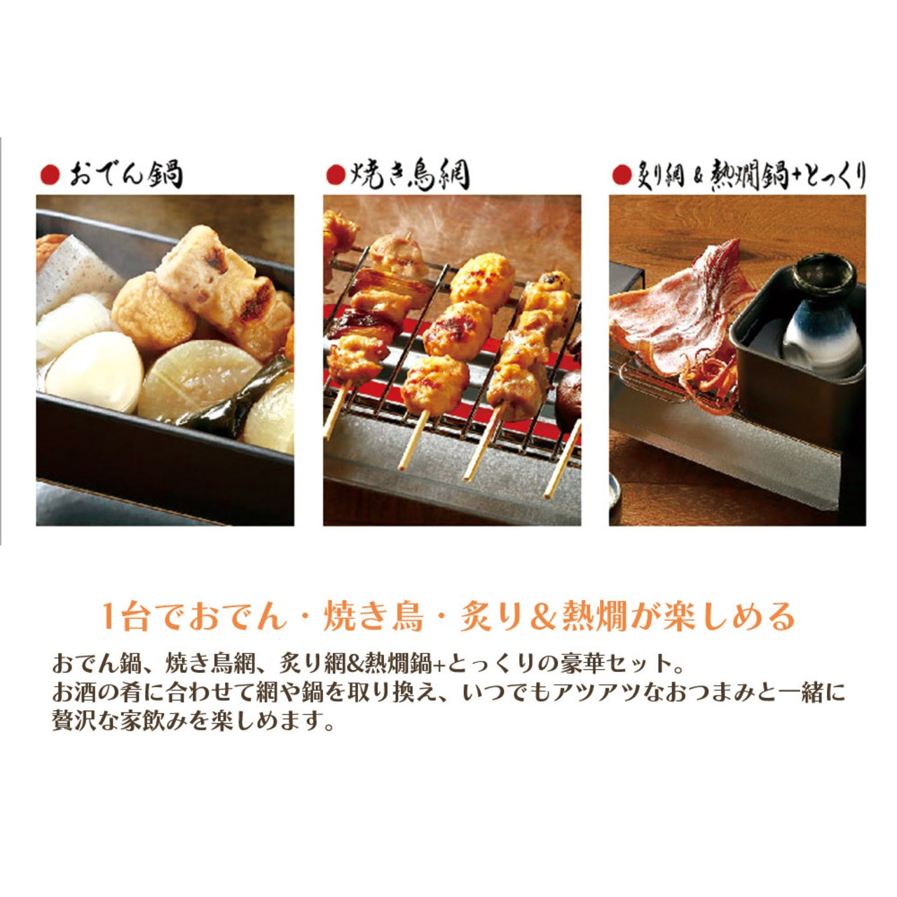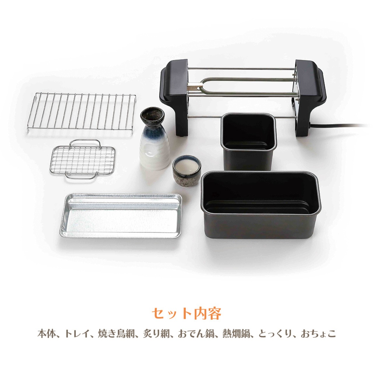 セット内容:本体、トレイ、焼き鳥網、炙り網、おでん鍋、 熱燗鍋、とっくり、おちょこ