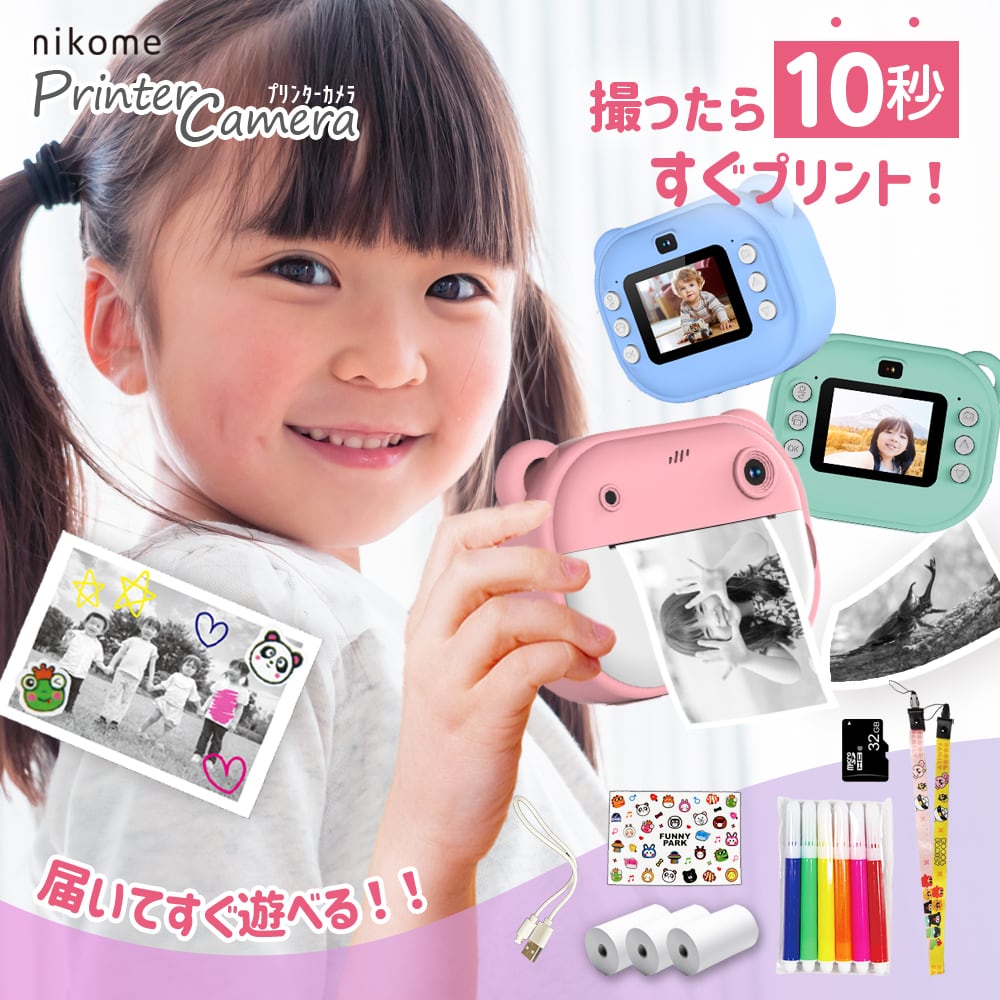 プリンターカメラ プリントカメラ トイカメラ キッズカメラ プリンター 感熱紙 シール 子供用 ゲーム内蔵 SDカード付 写真 動画 自撮り 子供 男の子 女の子 誕生日 クリスマス プレゼント NKM-PC01