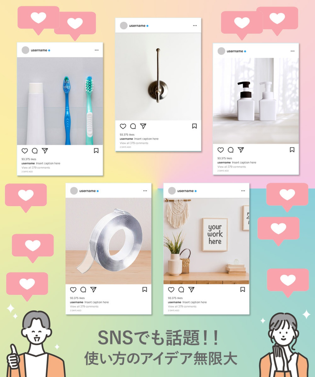 ・壁紙など接着面が柔らかい場所で貼り直しする際、壁紙自体が剥がれる可能性があるためご注意ください。