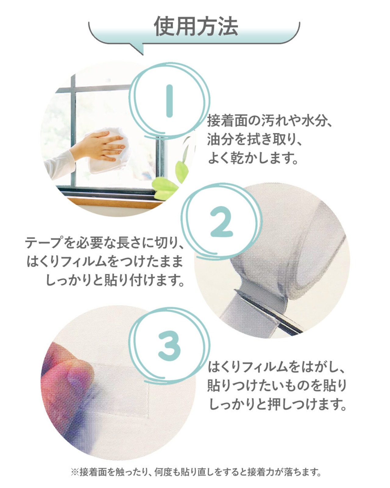 ※接着面を触ったり、何度も貼り直しをすると接着力が落ちます。
