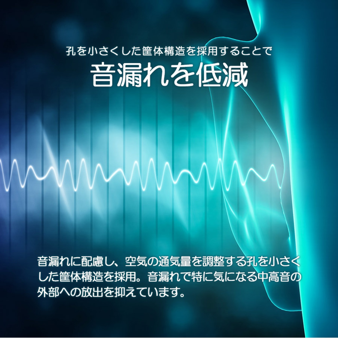 音漏れに配慮し、空気の通気量を調整する孔を小さくした筐体構造を採用。