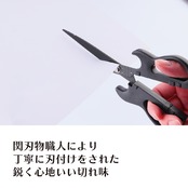関の刃物職人が1本1本丁寧に刃付けを行っており、切れ味も鋭くなっております。一般的なハサミの用途で紙類やビニール、テープ等にご使用いただけます。